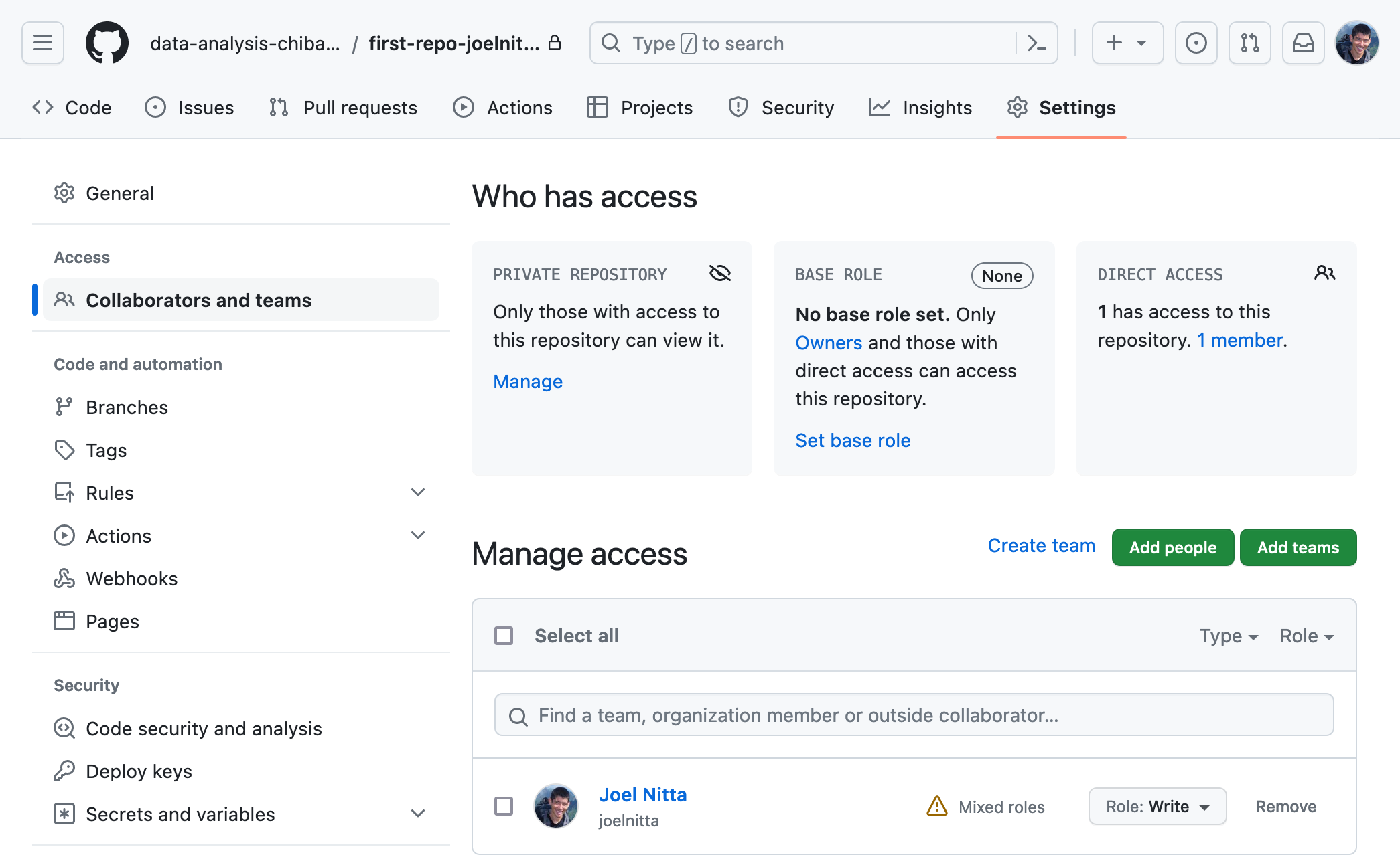Keep in mind that if someone else wants to clone your repository, an owner (in the case of assignments that is you or a teaching team member) must first add the individual(s) to the collaborators list in order for them to have access. This is because by default the repo is private to only you and the teaching team. You can change this if you wish by going to ‘Settings’ - see below.