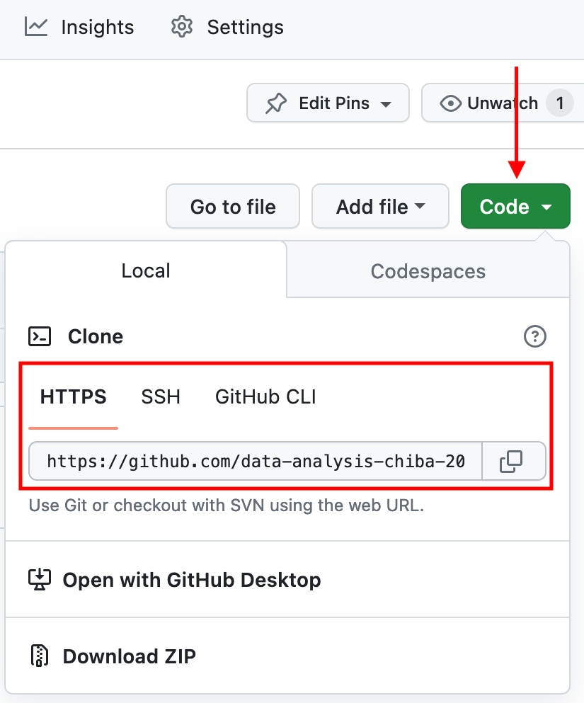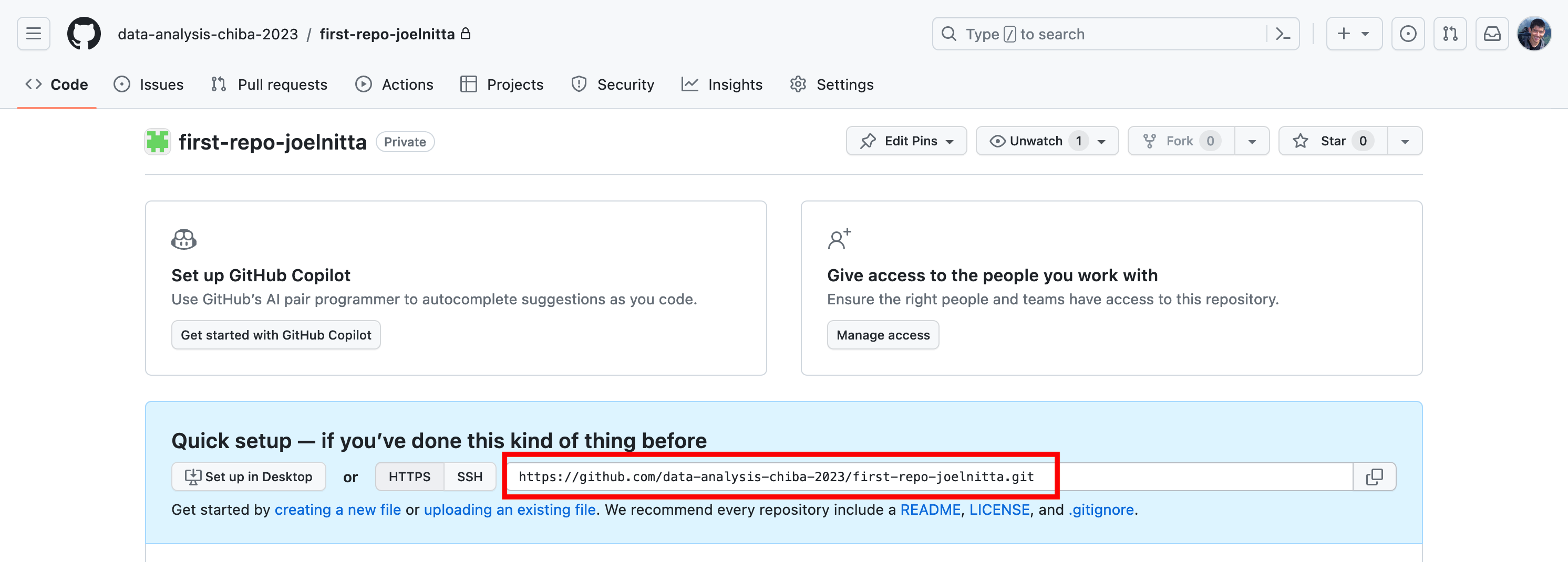 Copy the HTTPS (not SSH, since we set up authentication with your PAT) link from your GitHub repository website. It will be something like https://github.com/data-analysis-chiba-2023/first-repo-joelnitta.git See below.