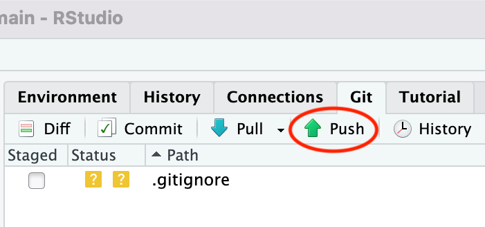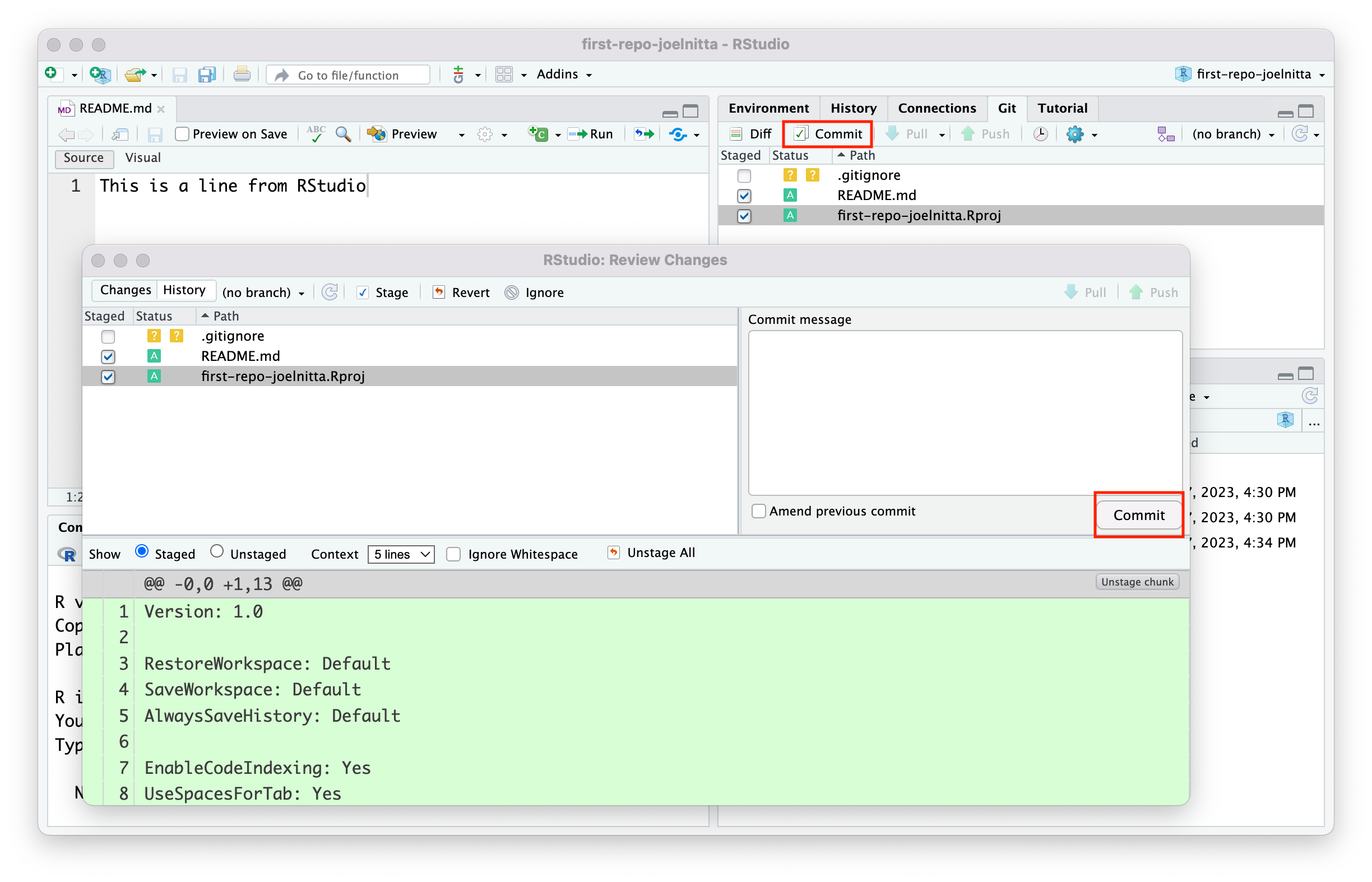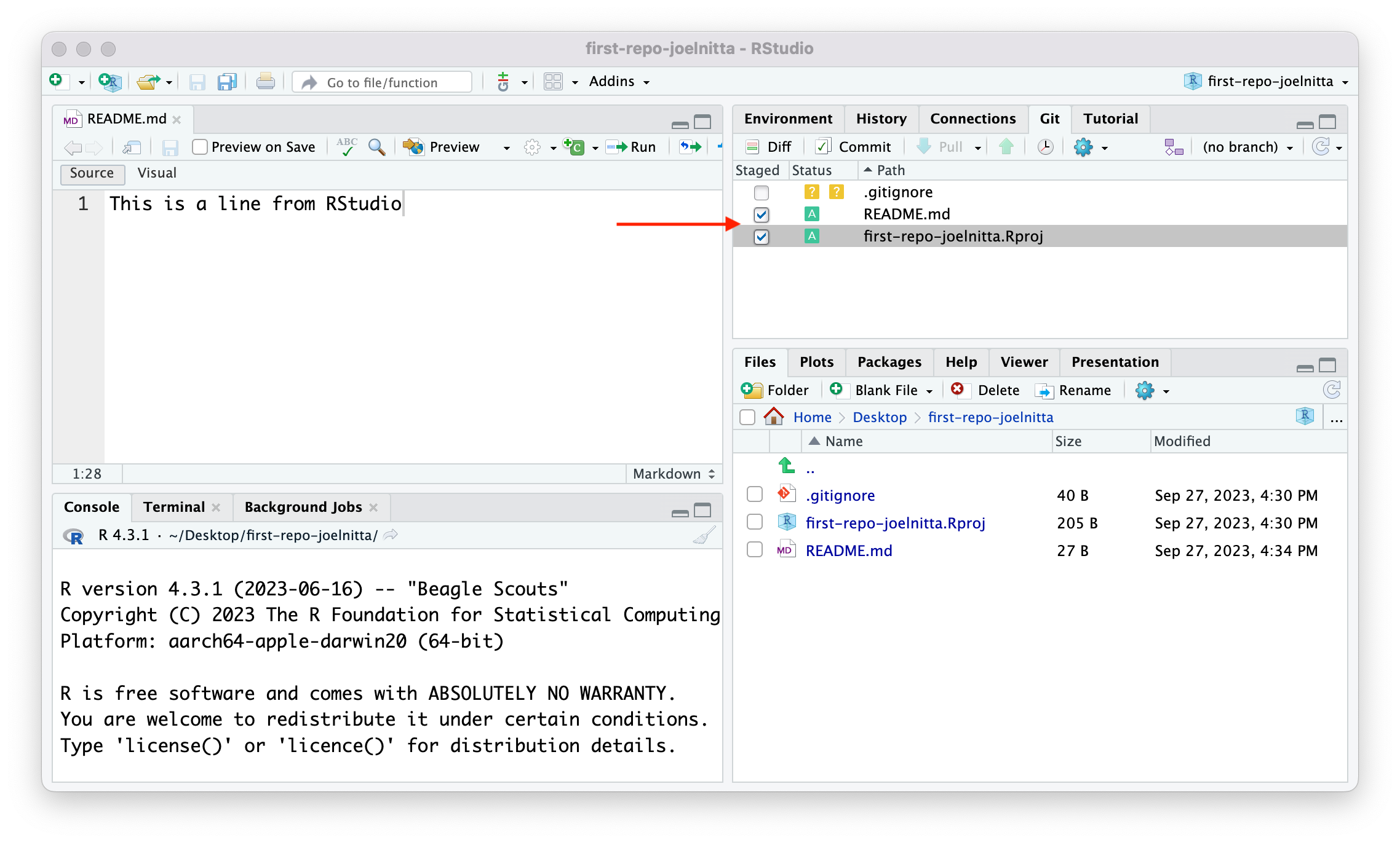 Stage the README.md file by going to the “Git” tab on top right of the RStudio window and check “staged”. Also stage the .Rproj file while you’re at it.