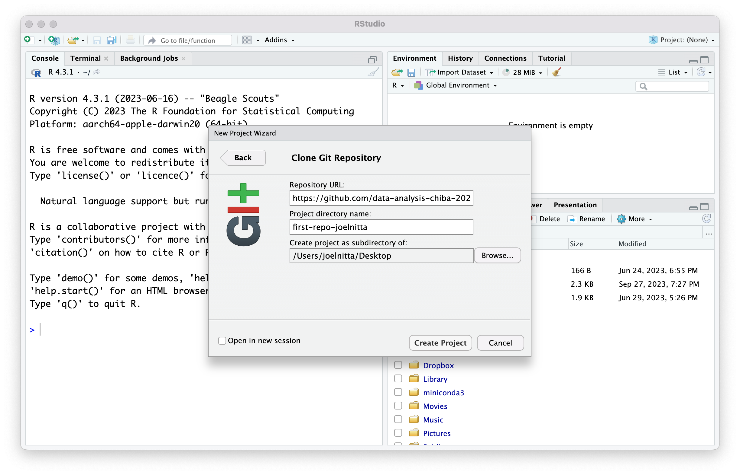 Confirm that a new directory has been created with the project directory name you specified. The directory now contains a .Rproj file. This is the RStudio project file. We will subsequently push this file to the remote repository.