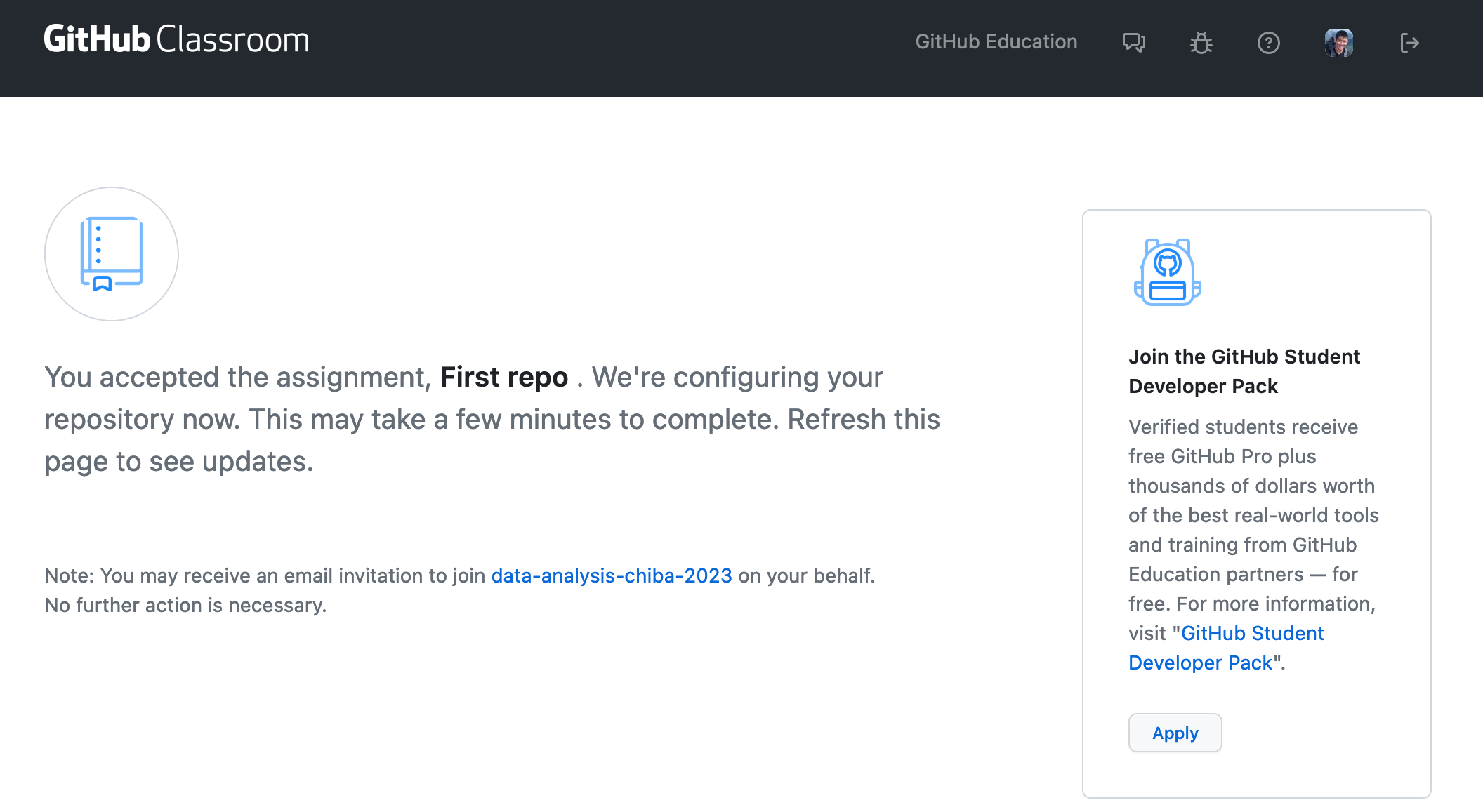 If all goes well, you’ll arrive at the ‘creating repo’ page. This could take a few minutes if the assignment contains a lot of files, but in most cases should be almost instantaneous. So go ahead and refresh your browser.