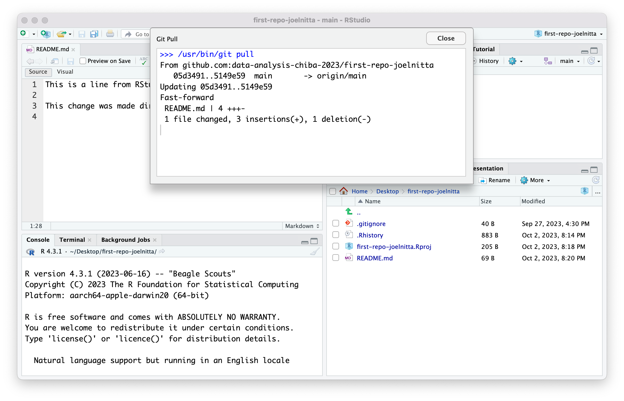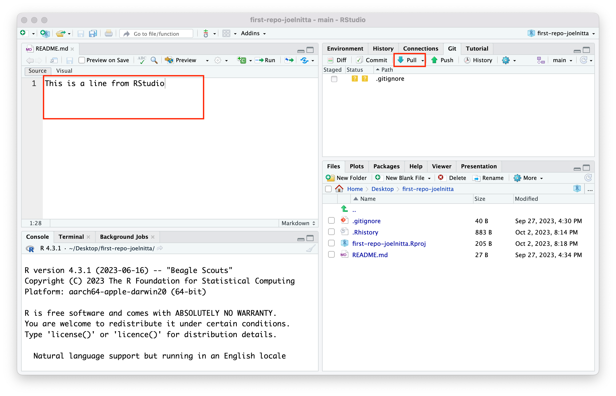 Go ahead and create a new file in your project directory (File->New File->Markdown file). Add the line “This is a line from RStudio”. Save your file to the local repo directory and call it README.md.