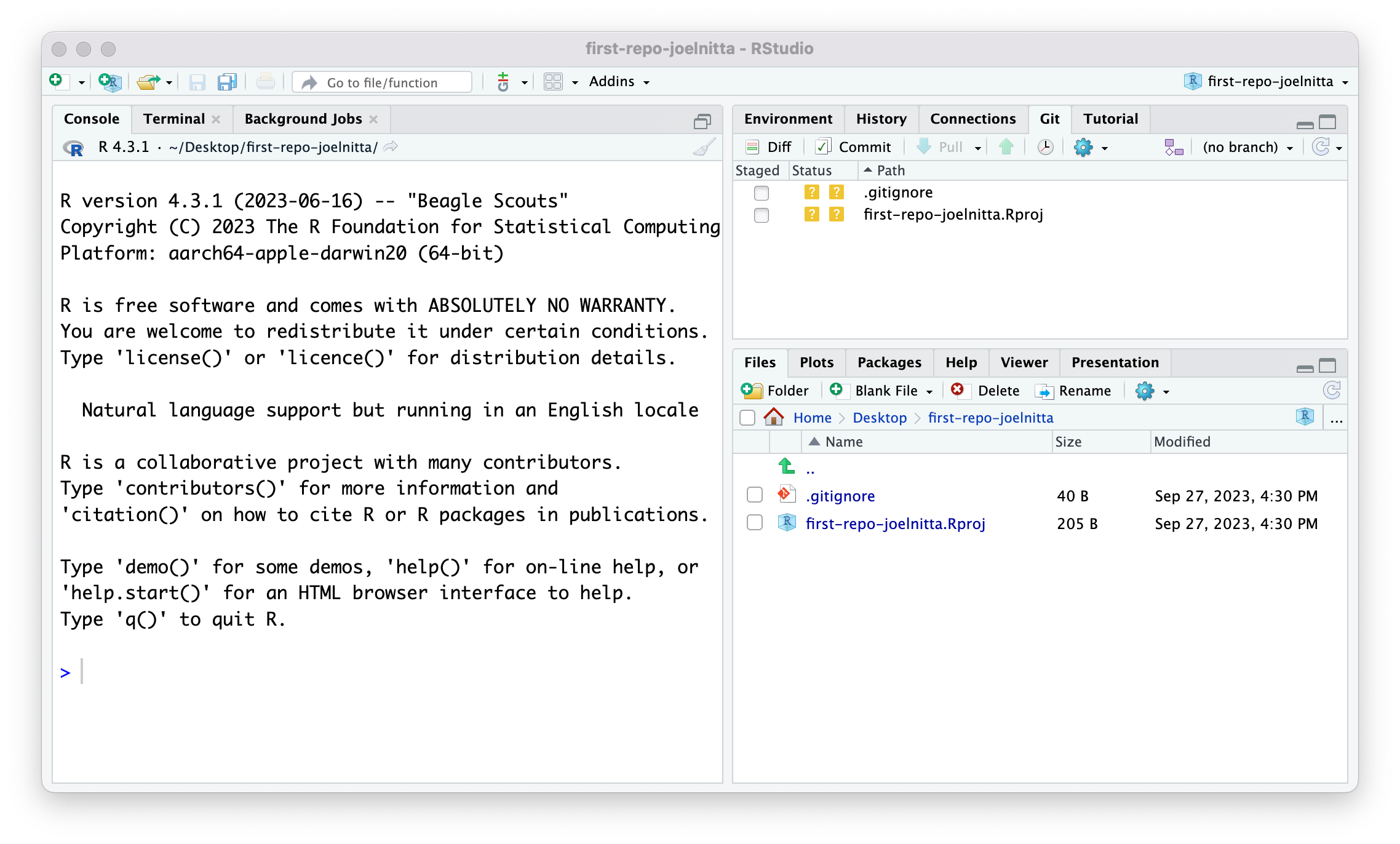 Notice that the project directory current contains nothing except for the automatically generated .Rproj and .gitignore file. Ignore this last file for now, we will talk about it later (ignore .gitignore, ha! It’s okay, you don’t have to laugh). This is not very exciting yet at all. So let’s add something.