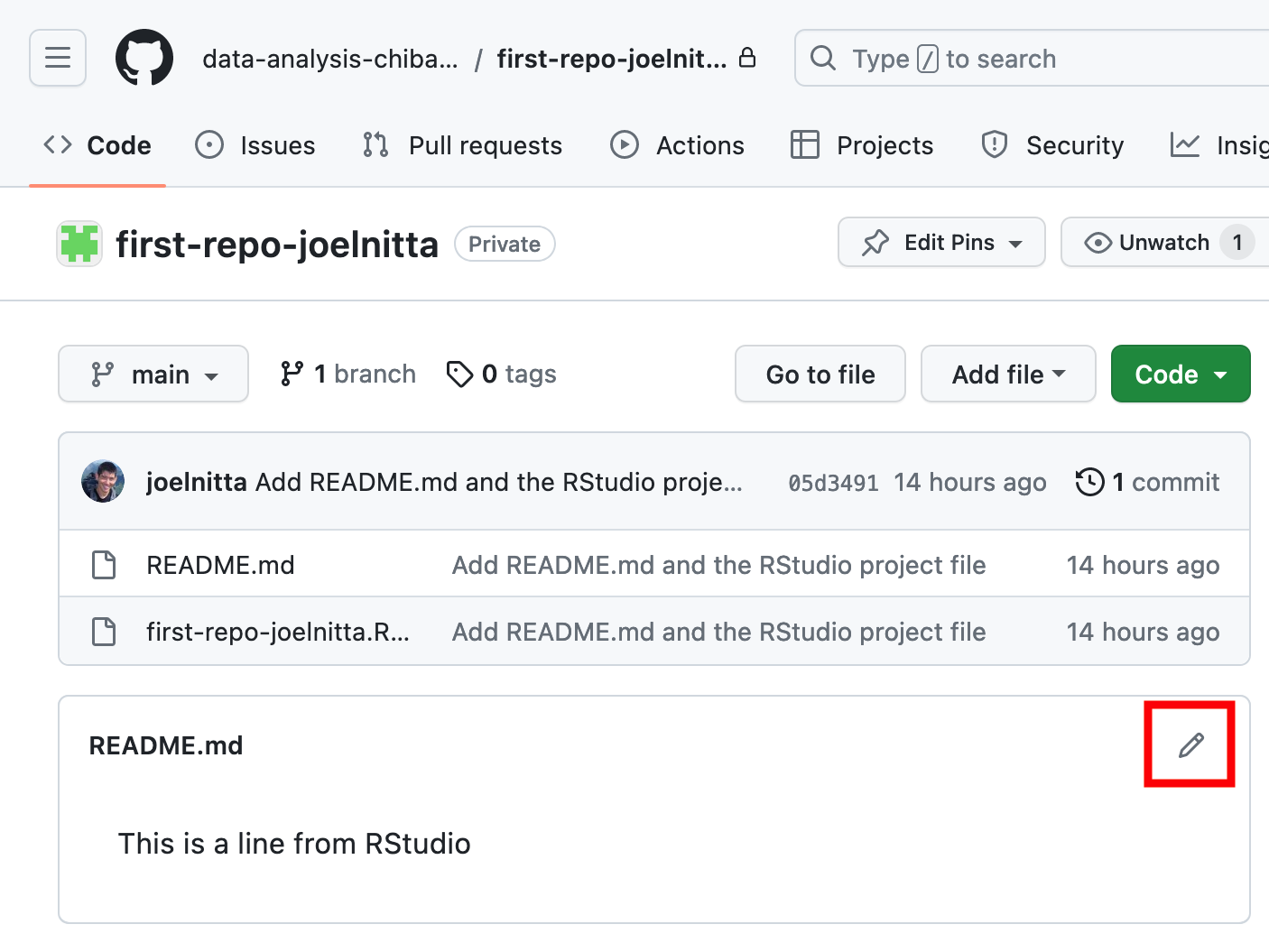 Click on the pencil. Add this line to README.md: “This change was made directly on GitHub.” Put in a commit message and commit directly to the “main” branch. Now you should see this.