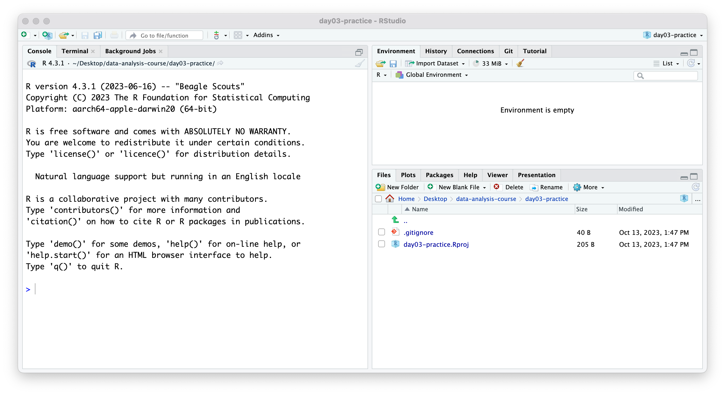 RStudio has created two files automatically, day03-practice.Rproj and .gitignore