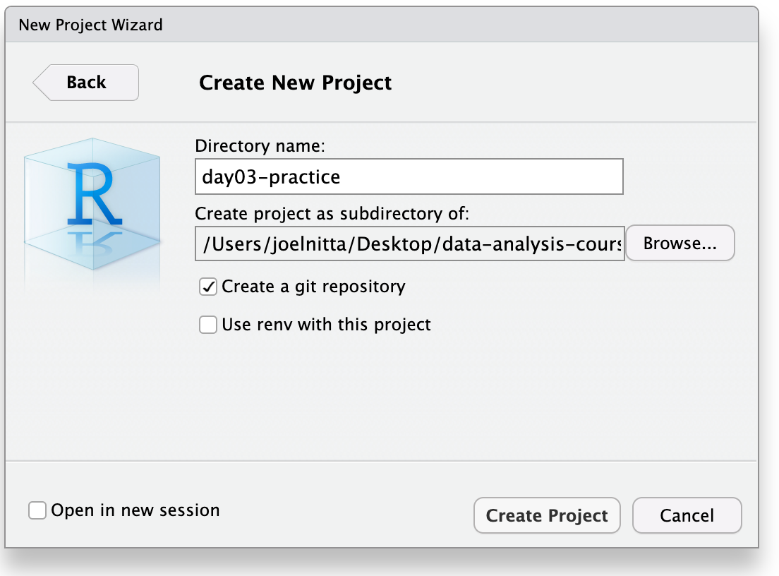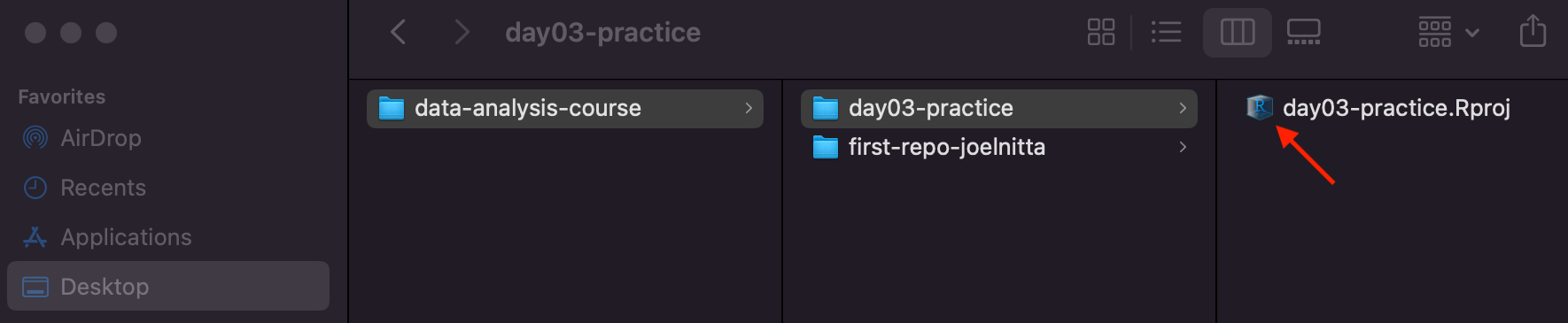 Let’s put call this project day03-practice and put it in the data-analysis-course folder on the Desktop