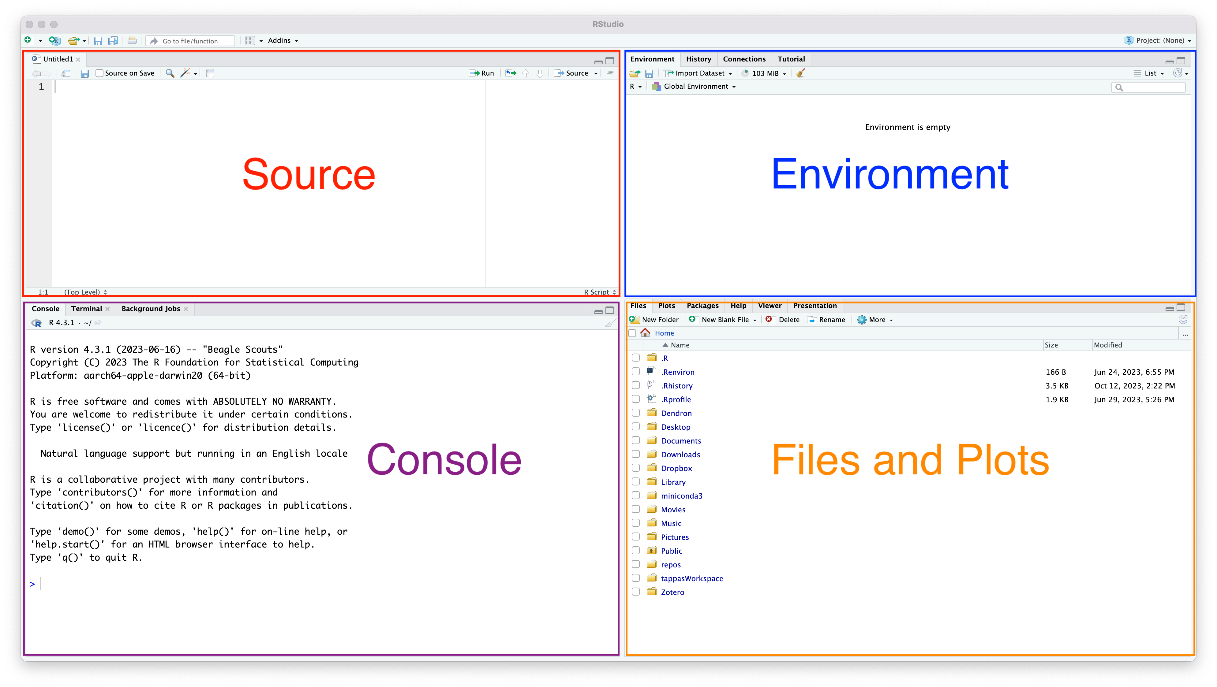 x <- 2 + 2 and hit the “Enter” keyNotice that R does not run the code, since this is the file editing pane, not the R console