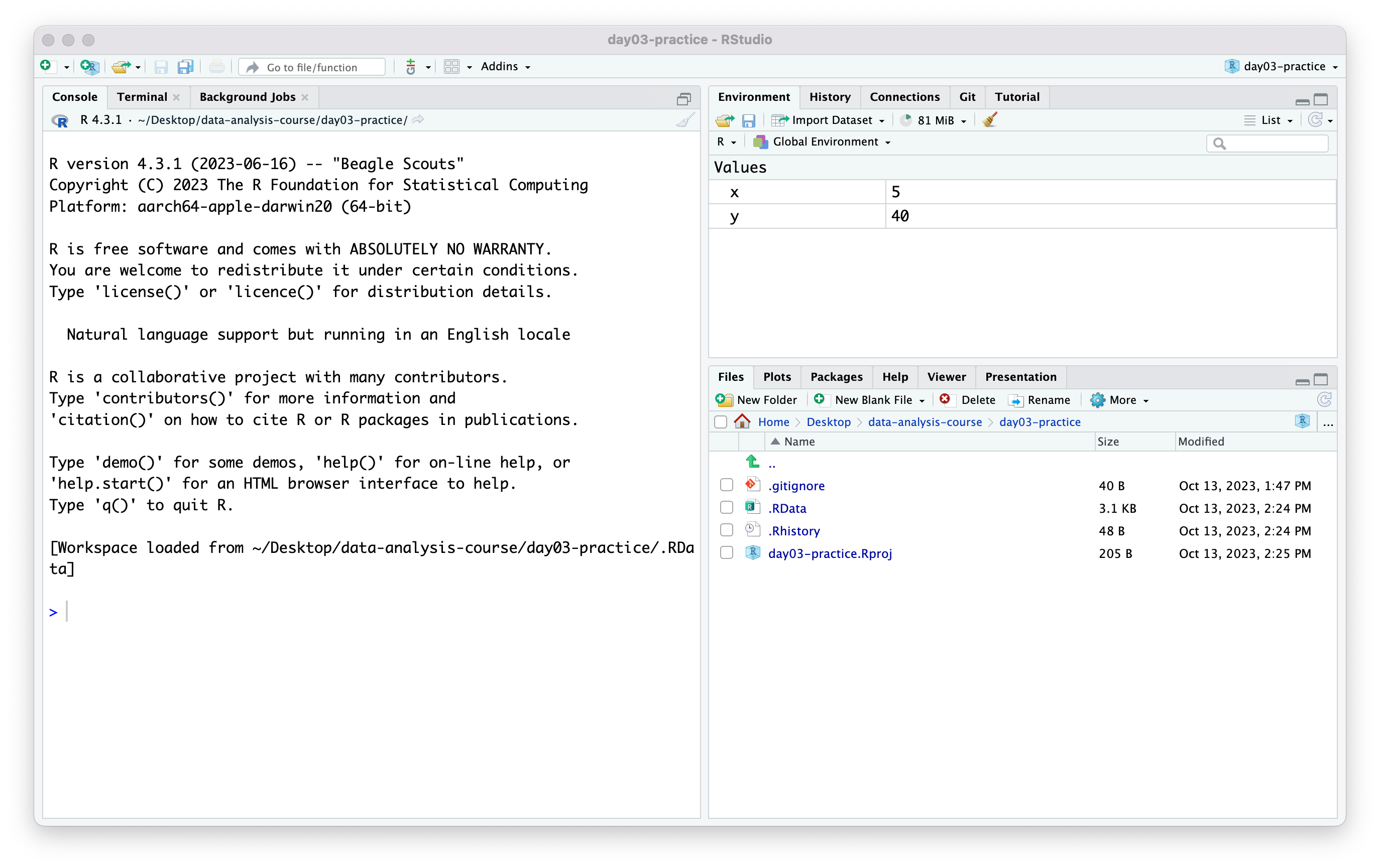 data-analysis-course/day03-practice on your Desktop and clicking on day03-practice.Rproj.x and y are still there, even though the code that we typed last time is gone!