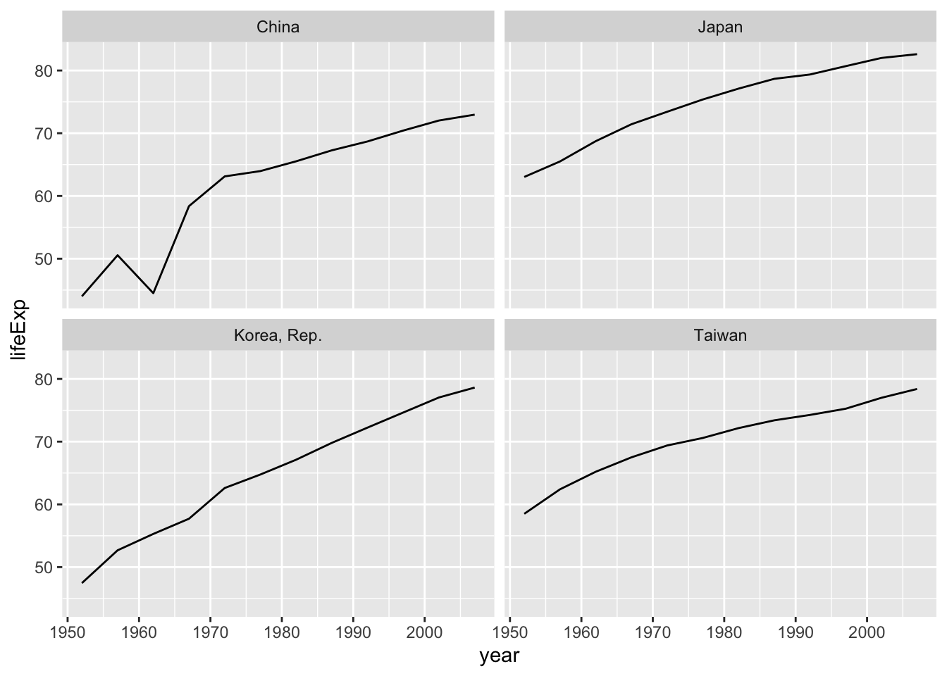 gapminder_asia <-filter( gapminder, country %in%c("Japan", "China", "Korea, Rep.", "Taiwan"))
