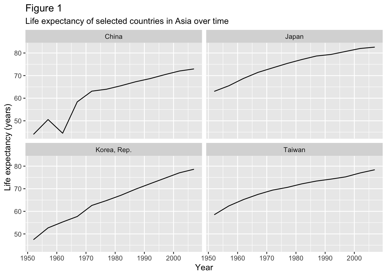 To clean this figure up for a publication we need to change some of the labels. The y axis should read “Life expectancy”, rather than the column name in the data frame. It’s also a good idea to indicate the units of the data (years for life expectancy).