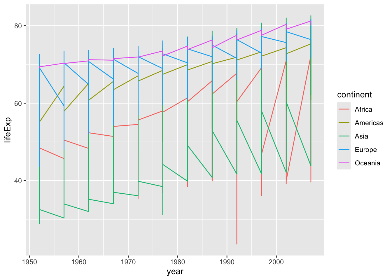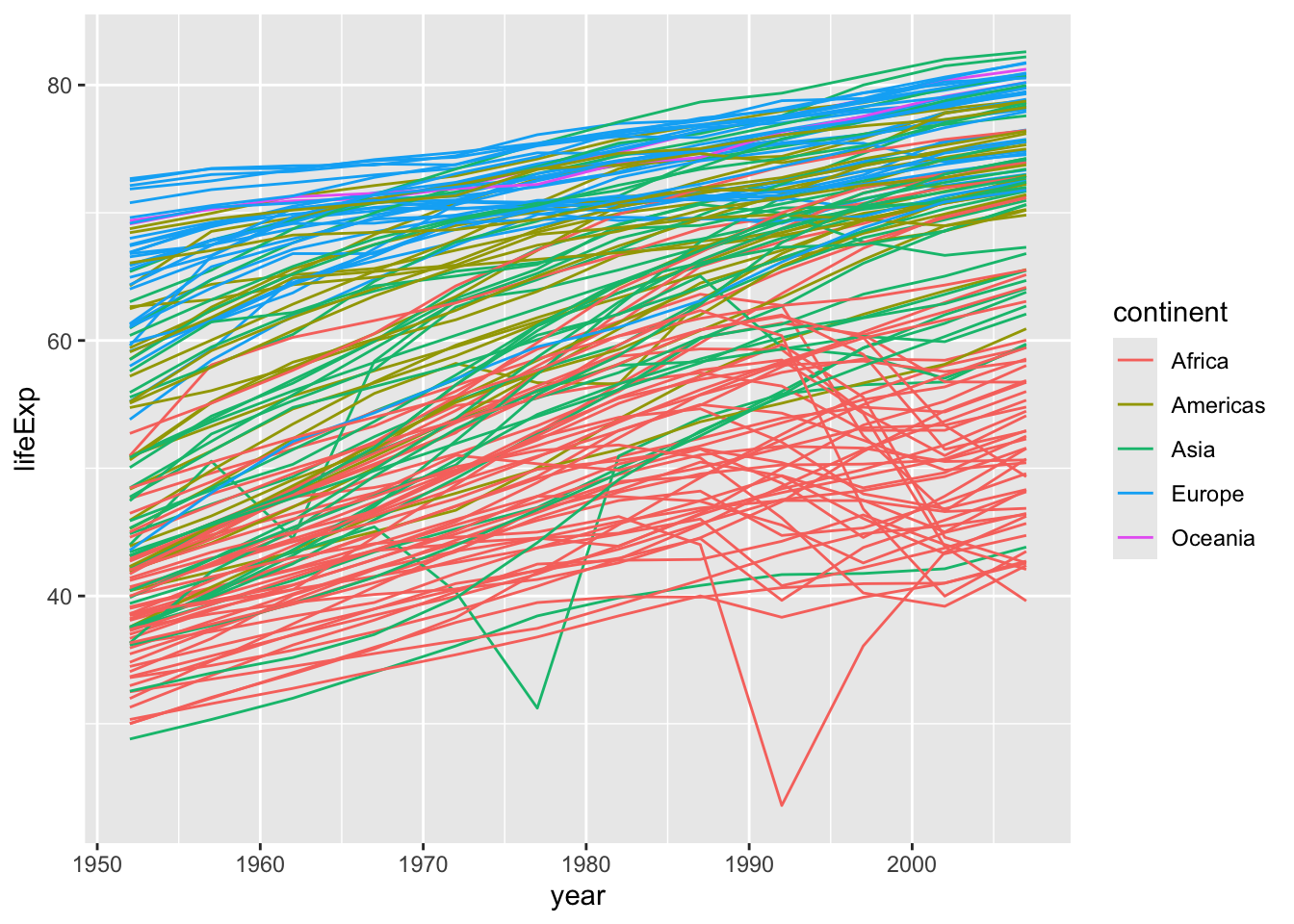 ggplot(data = gapminder, mapping =aes(x = year, y = lifeExp, color = continent)) +geom_line()