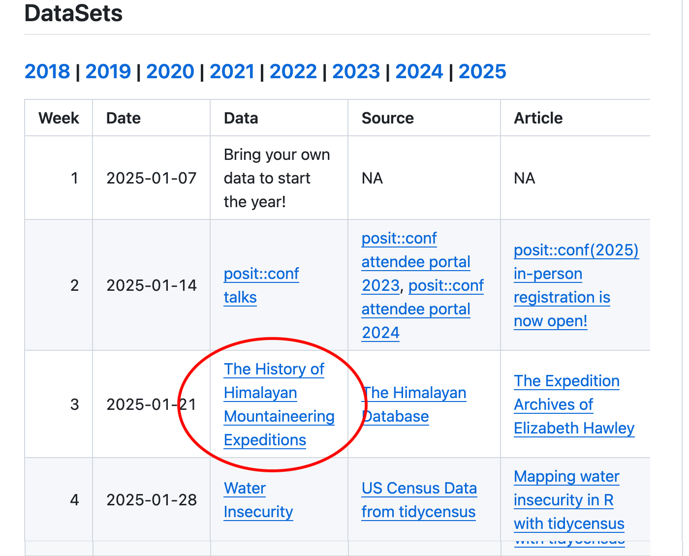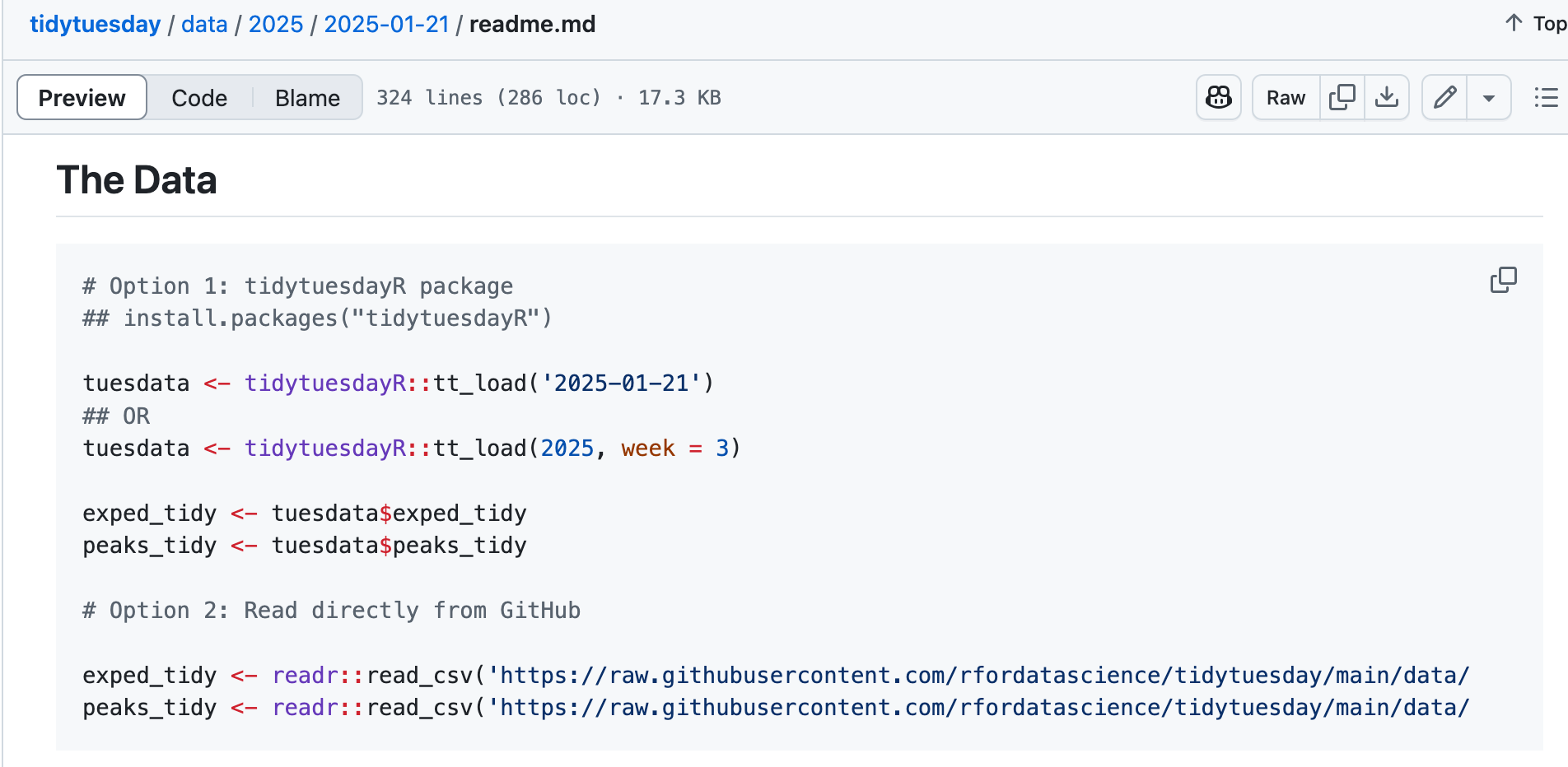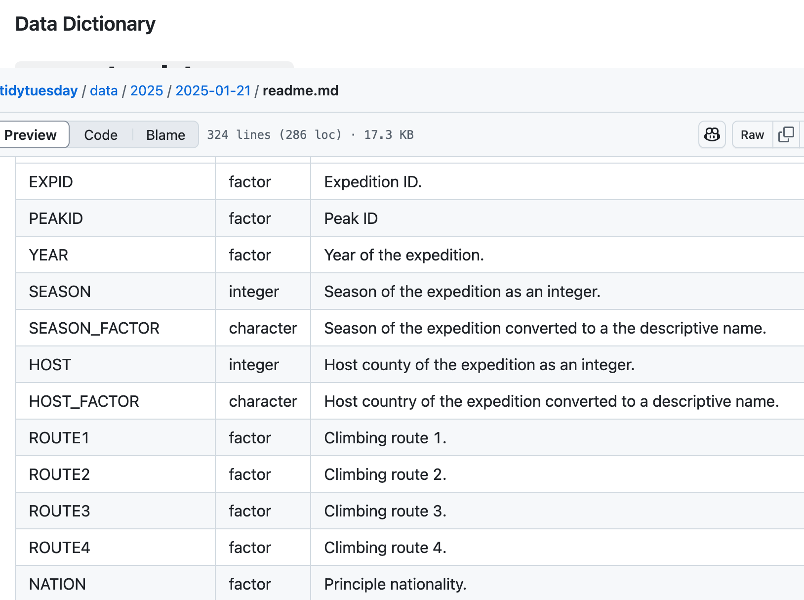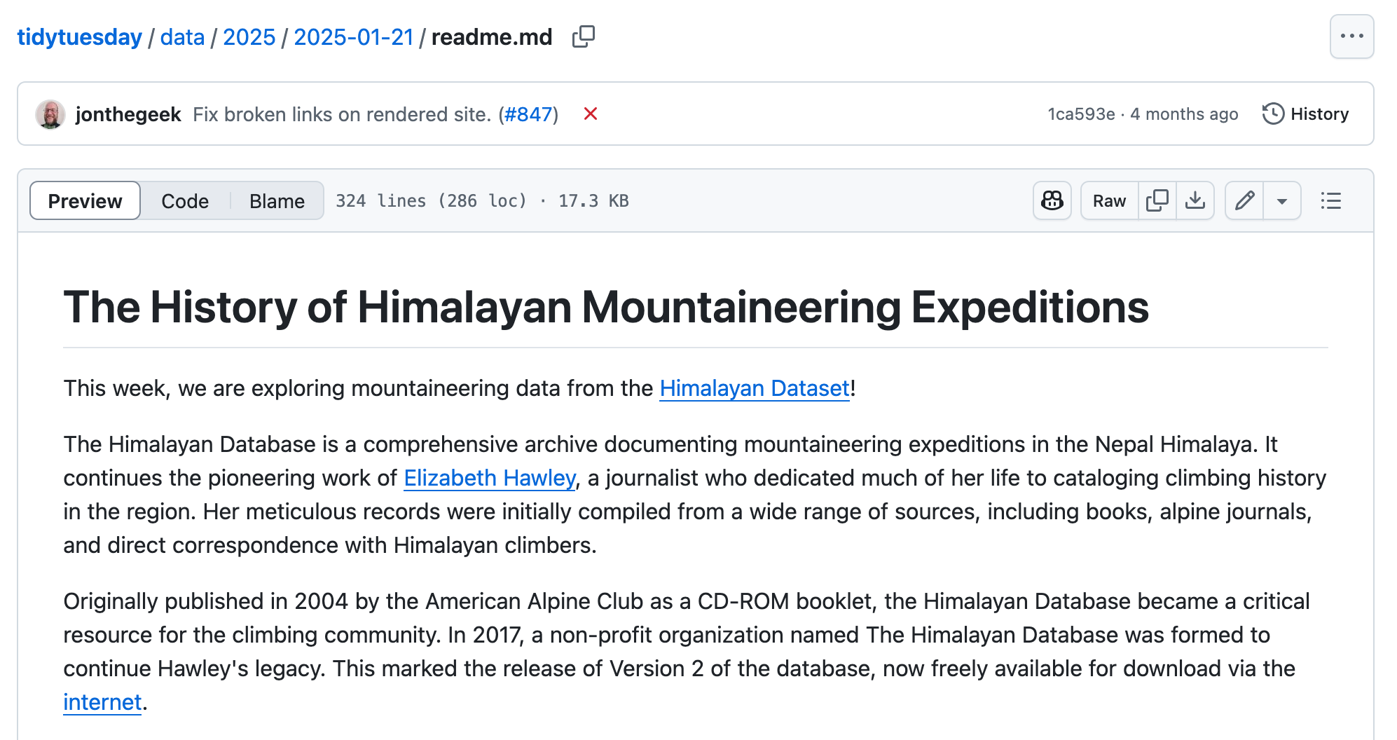 This will take us to the README file (a file that explains basic info about a piece of software, dataset, or analysis) for the “History of Himalayan Mountaineering Expeditions” dataset.