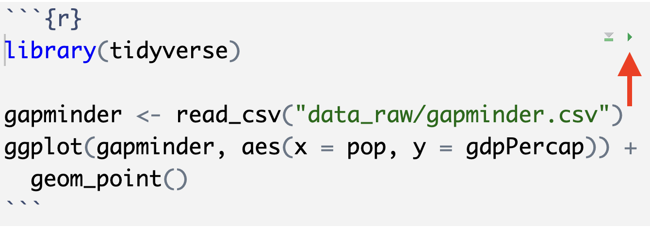 To run the R code in a chunk in your current R session, press the green “play” button at the right-hand side of the chunk