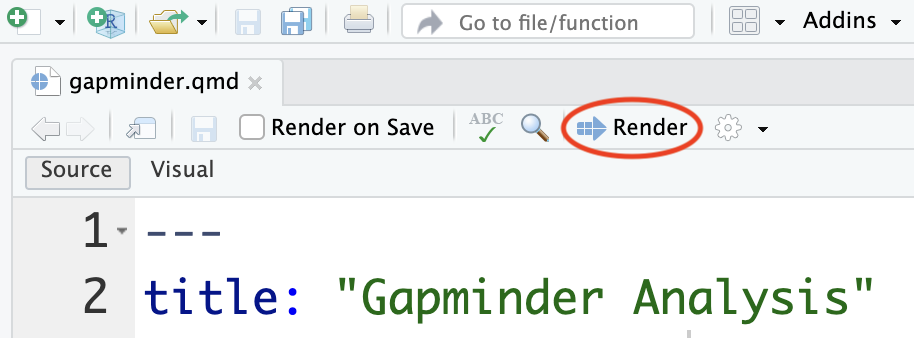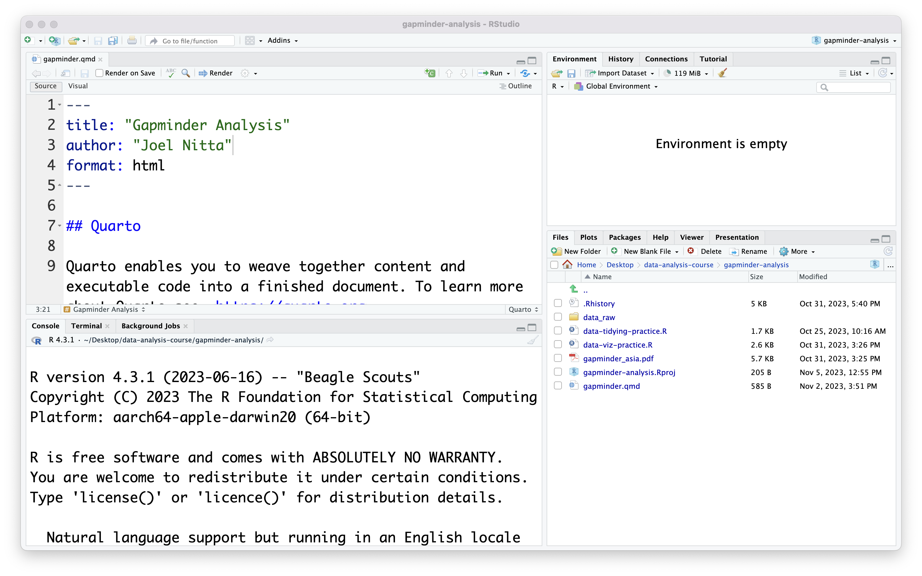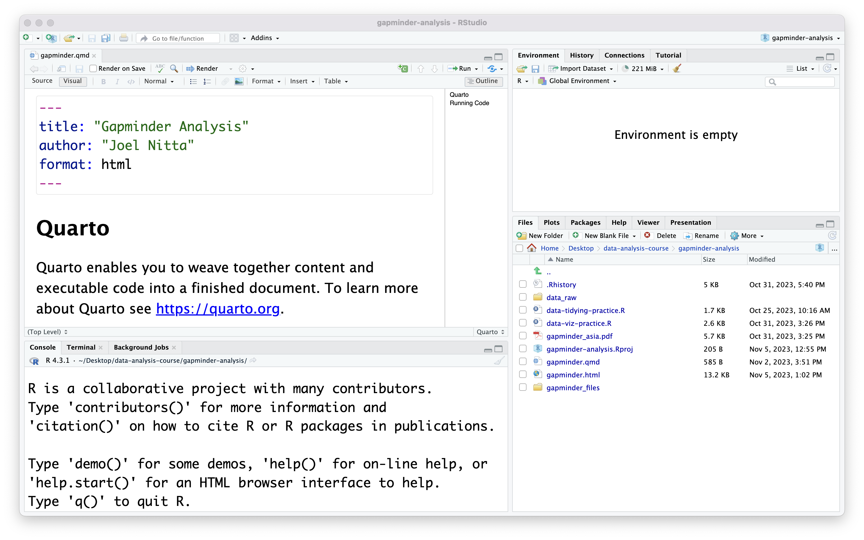 gapminder-report.html fileNotice the formatting of the output: lines like ## Quarto appear as headers